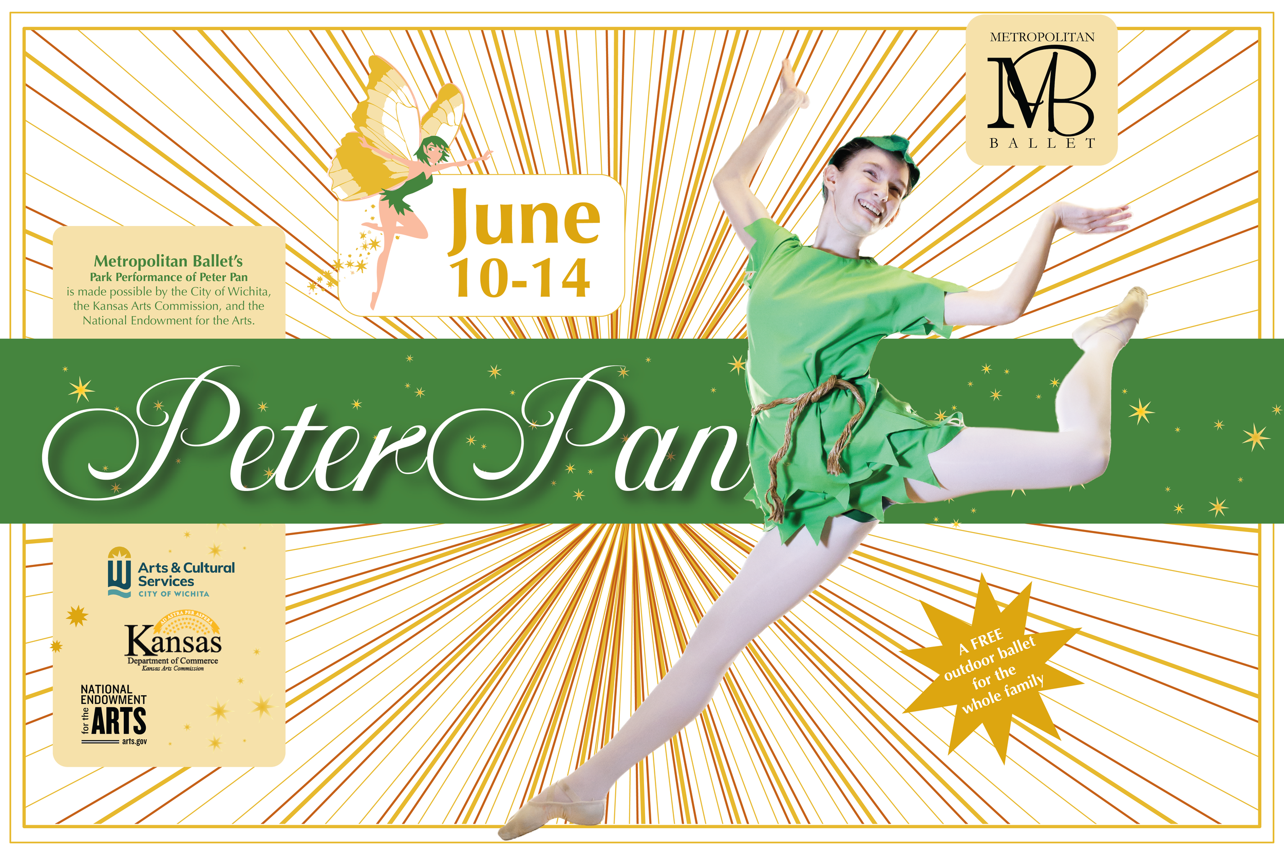 Metropolitan Ballet is thrilled to bring Peter Pan to local and area parks surrounding Wichita June 10-14! See Peter visit the Darling children one night and go on adventures in Neverland with pirates, mermaids, lost boys, and a crocodile.